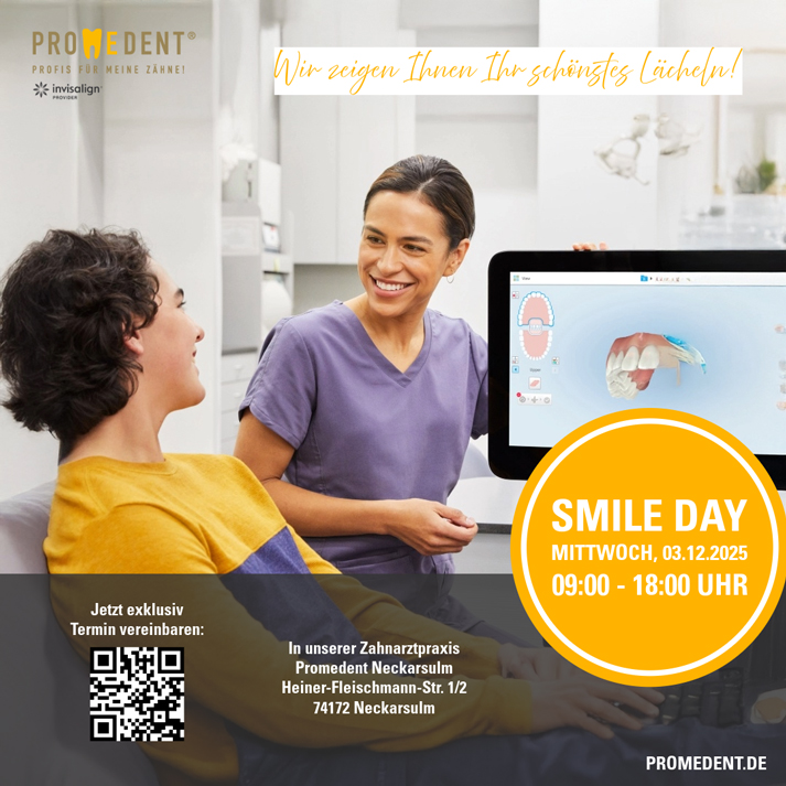 Beim Smile Day am 03.12.2025 können Sie, liebe Patienten und Interessierte, Ihre Zähne digital scannen lassen und unser erfahrener Kollege Zahnarzt & M.Sc. Kieferorthopädie Max Pfeifer und sein Team, zeigt Ihnen anhand einer Simulation am Computerbildschirm, wie Ihr Lächeln nach einer Therapie mit Invisalign®-Zahnschienen (sogenannten Alignern) aussehen könnte.